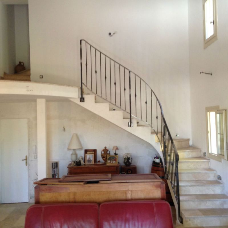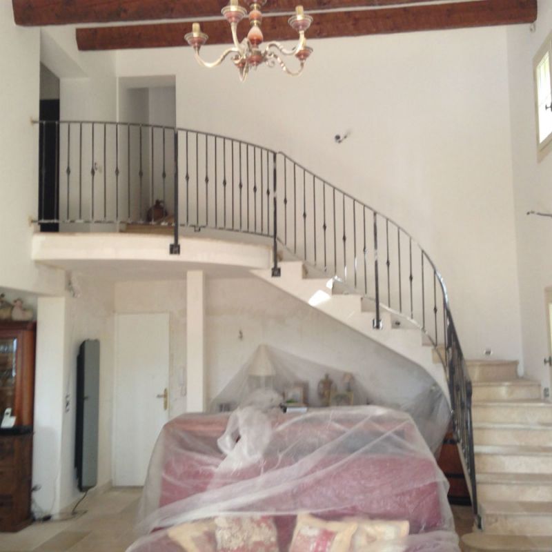 Fabrication et pose d une rampe en fer plein forgé a Gemenos , débillardé , avec création d un gardes corps de palier en arrondi