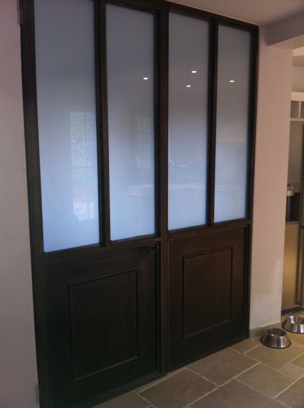 Fabrication et pose d'une porte en acier sur mesure finition patiné brunisseur de métaux avec des verres opaques à Auriol